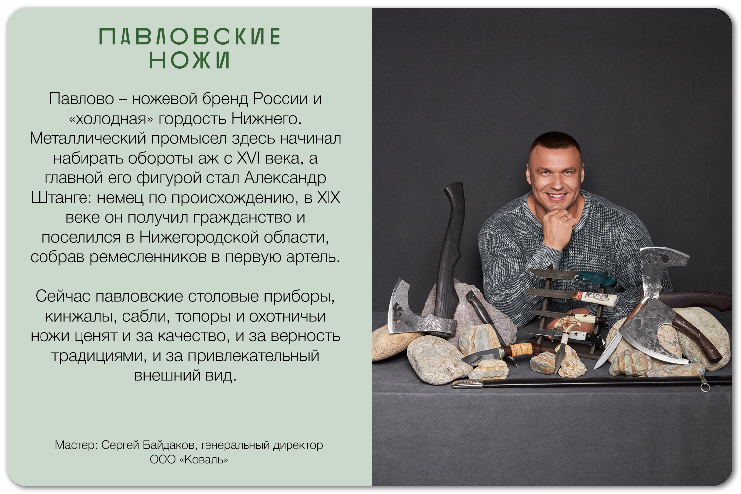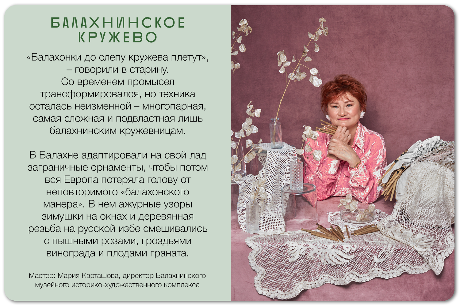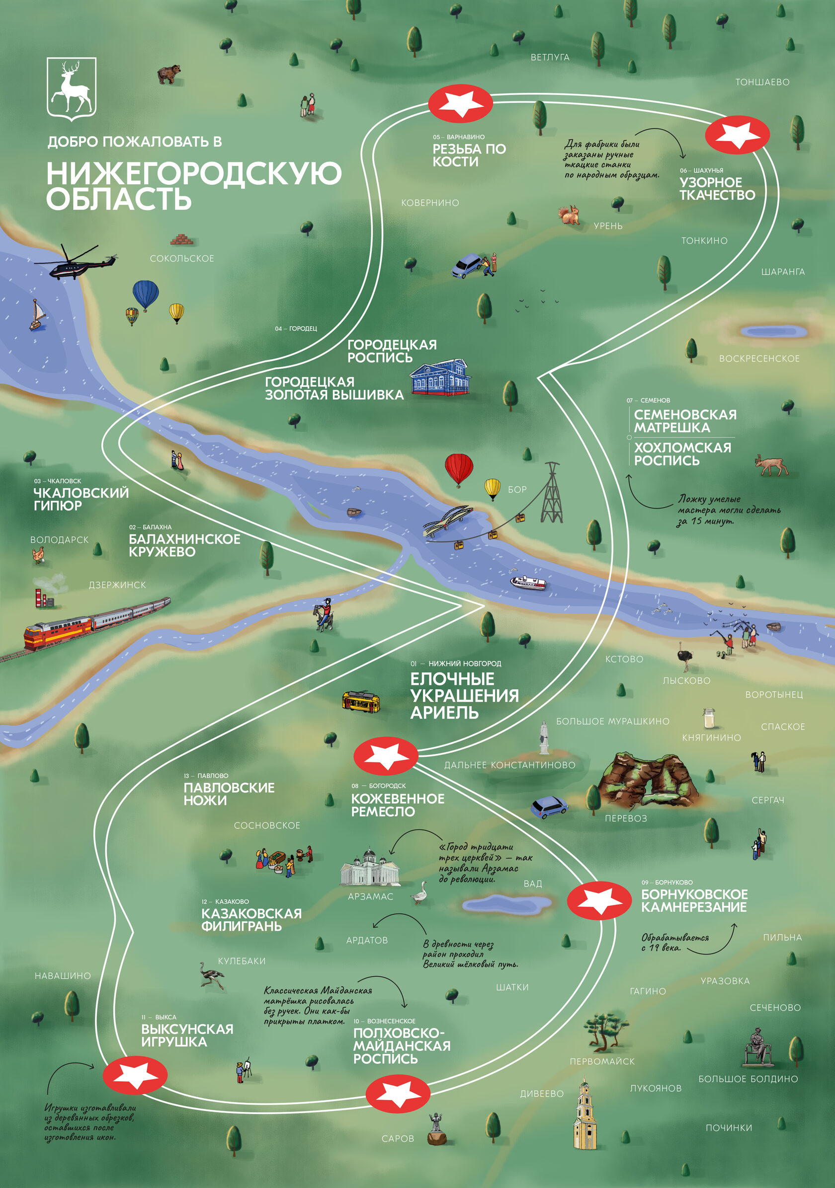 Главные герои нашего нового фотопроекта – мастера художественных промыслов, которые на вес золота. Взять, например, балахнинское кружево – ни одна машина не справляется так, как искусная мастерица. Навыки передаются из поколения в поколение, произведения удачно интегрируются в нашу повседневную жизнь, а мотивы родных промыслов и вовсе вшиты в наше ДНК – в детстве нас завораживали ажурные узоры на зимних окнах да расписные цветы на красавицах-матрешках. Все это – основа нашего самосознания, наш культурный код. Ведь как говорят мастера, человек неотделим от своих традиций. На карте изображена только часть предприятий. В Нижегородской области их гораздо больше, и мы пока в самом начале исследования. Итогом должна стать полная карта художественных промыслов региона в 2024 году.